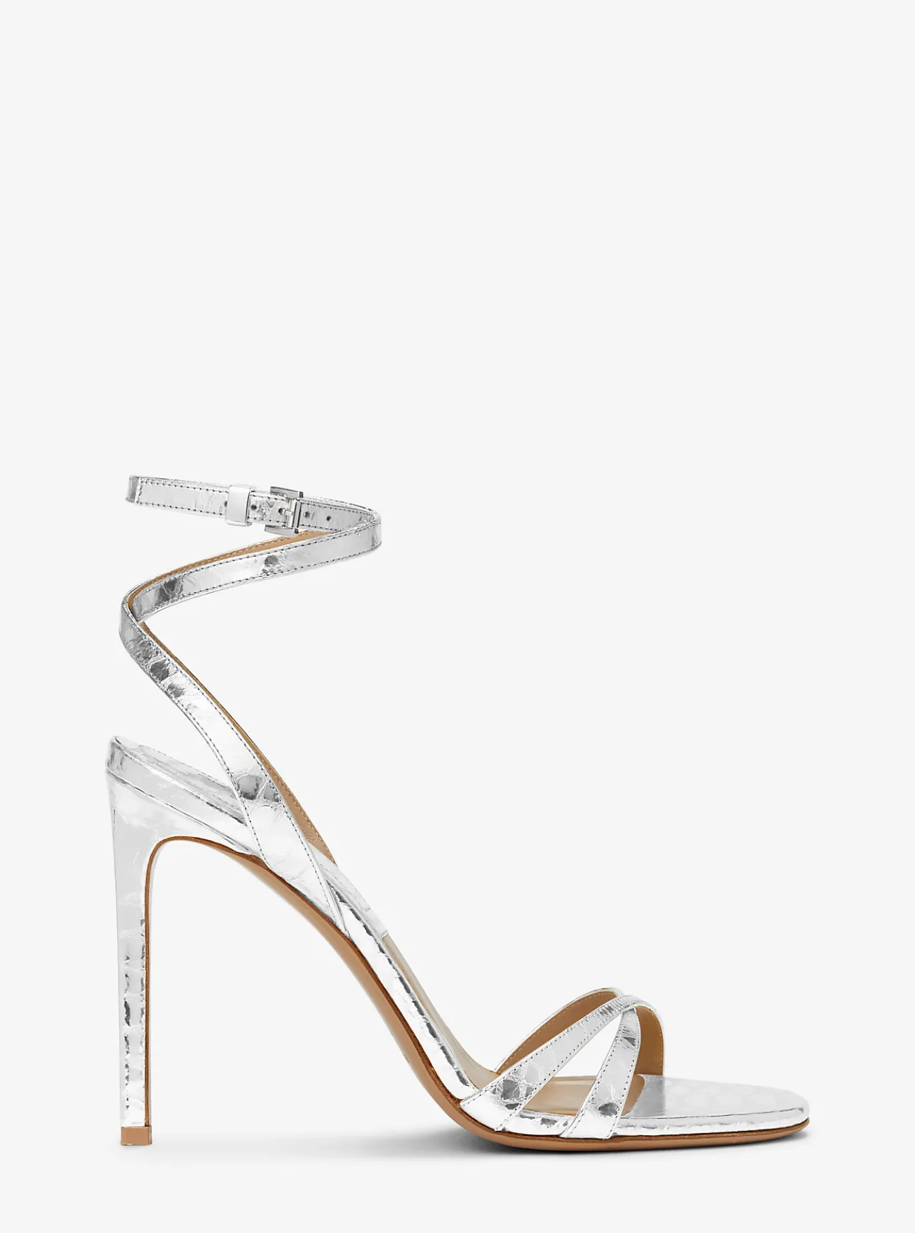 Styled with sarong skirts on the Spring/Summer 2023 runway, the Chrissy sandals are crafted in Italy from metallic, python-embossed leather. They feature slim crossover straps at the toes and ankle, and rest on a leg-lengthening stiletto heel. With a sophisticated yet alluring silhouette, they’ll fast become your go-to evening shoes.