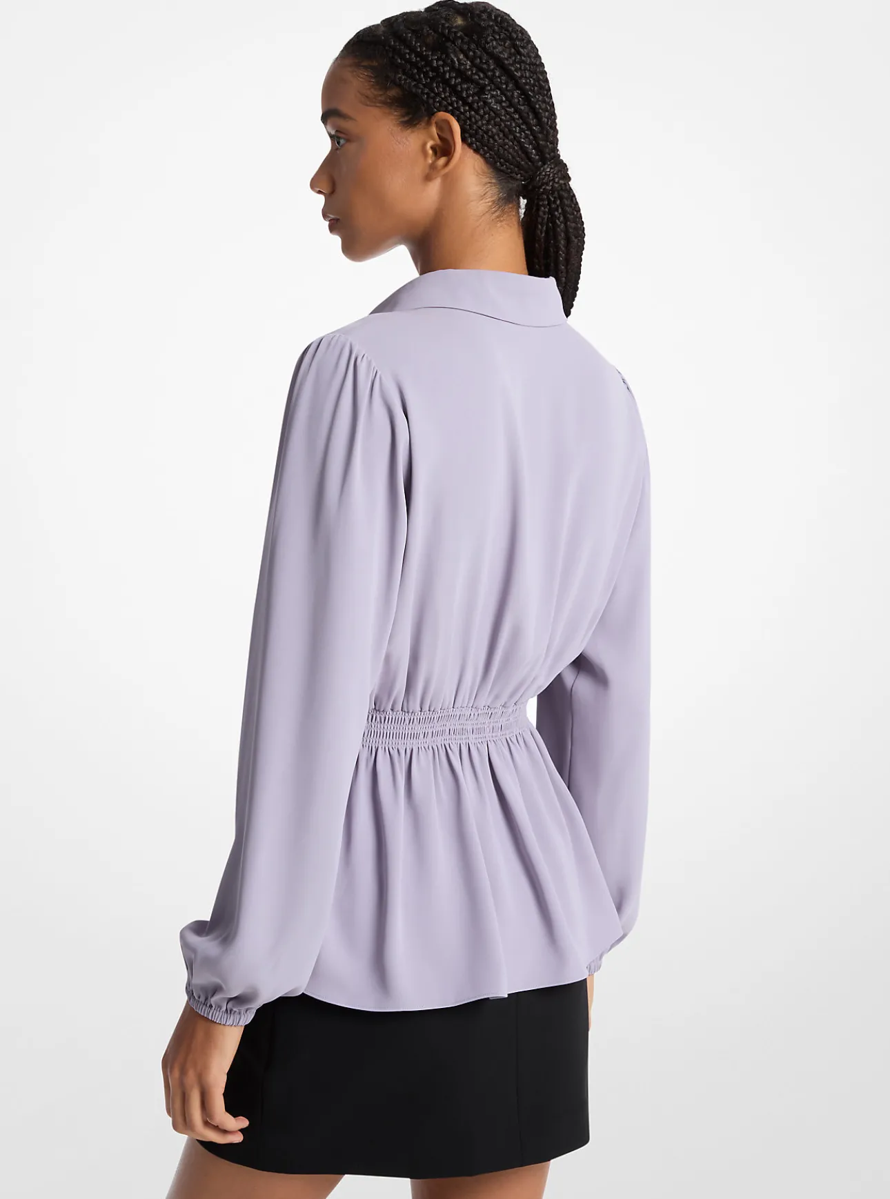 This shirt borrows elements from classic shirting yet still reads soft and feminine. It’s tailored from crepe in a body-skimming fit with smocking to draw attention to the waist. Partner it with a skirt and heels for day to night ease.