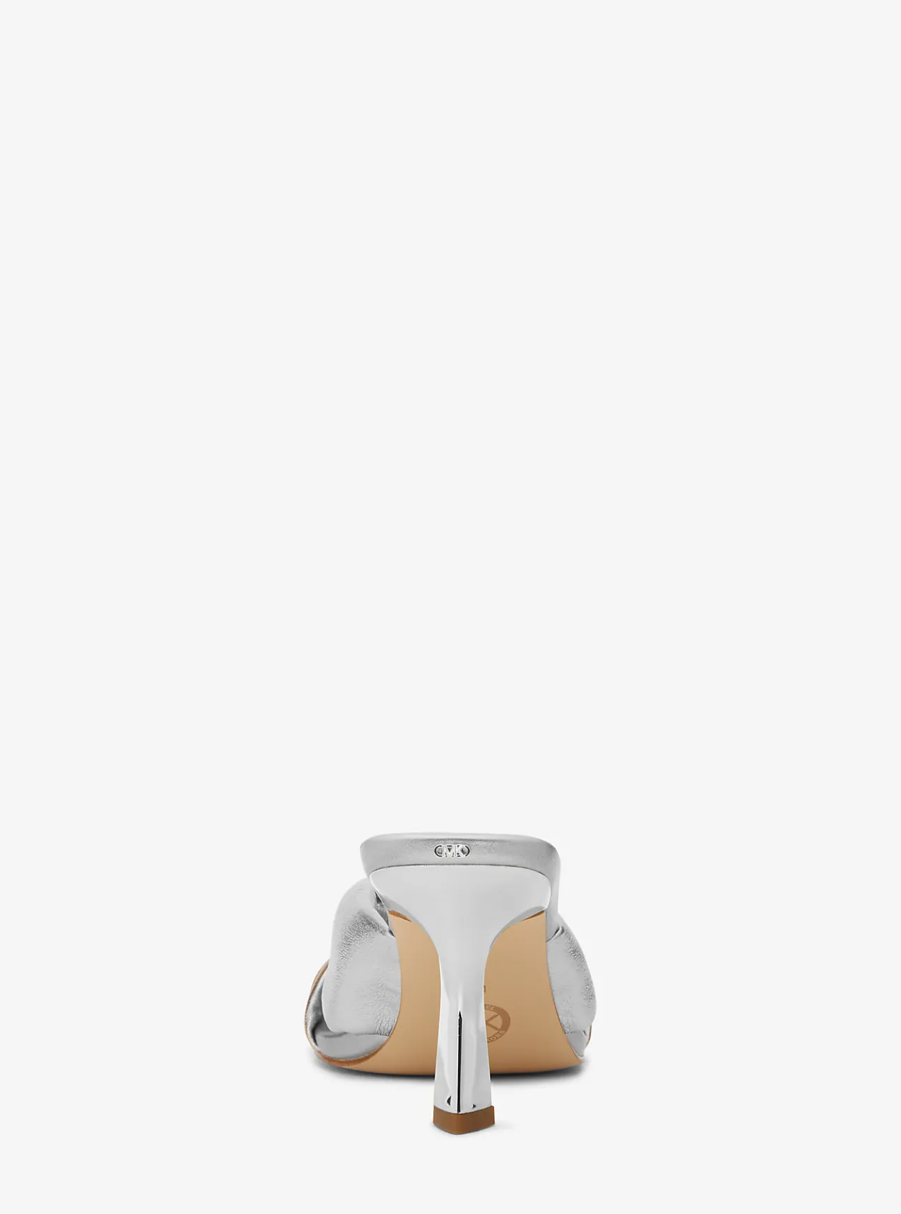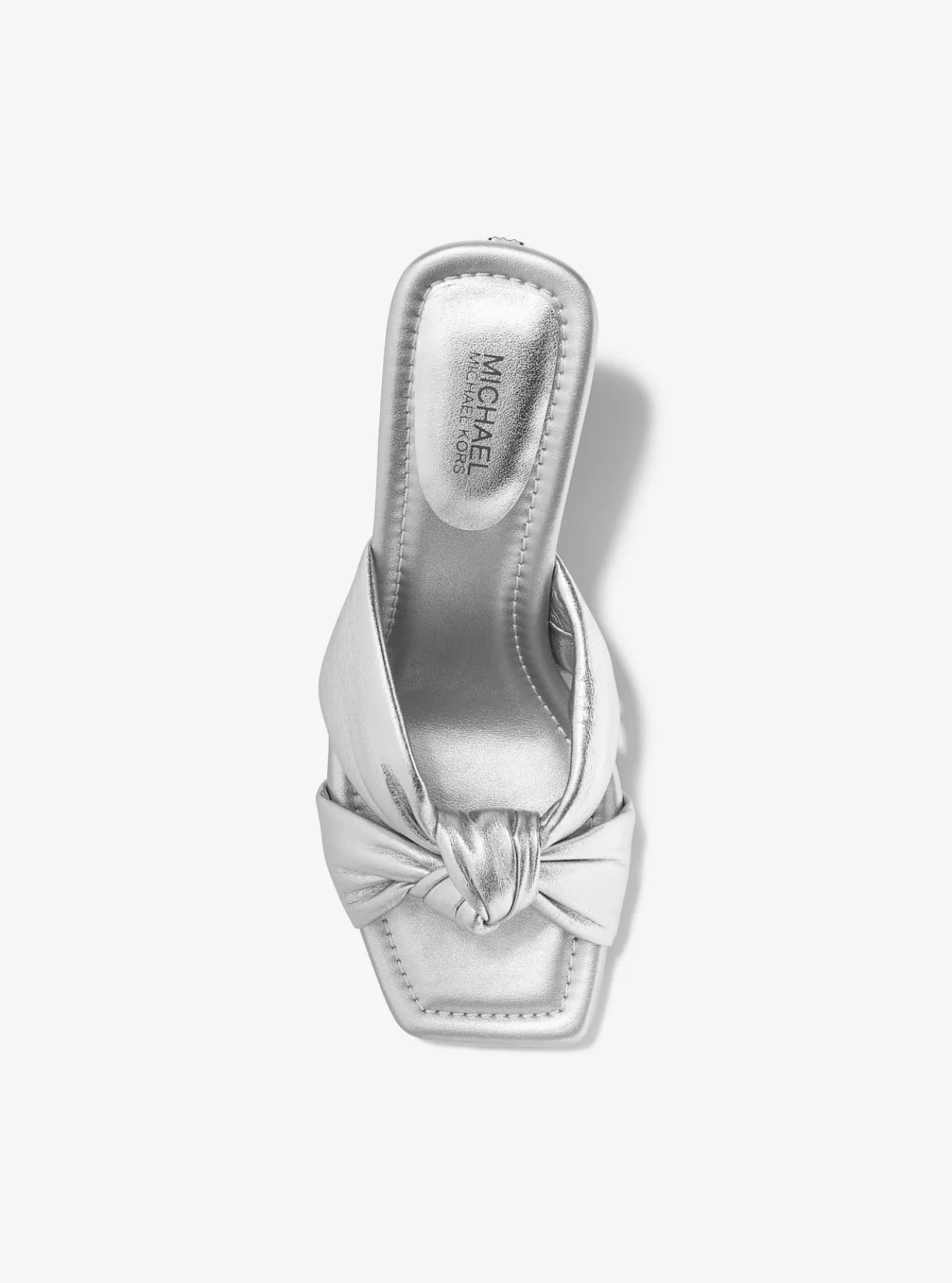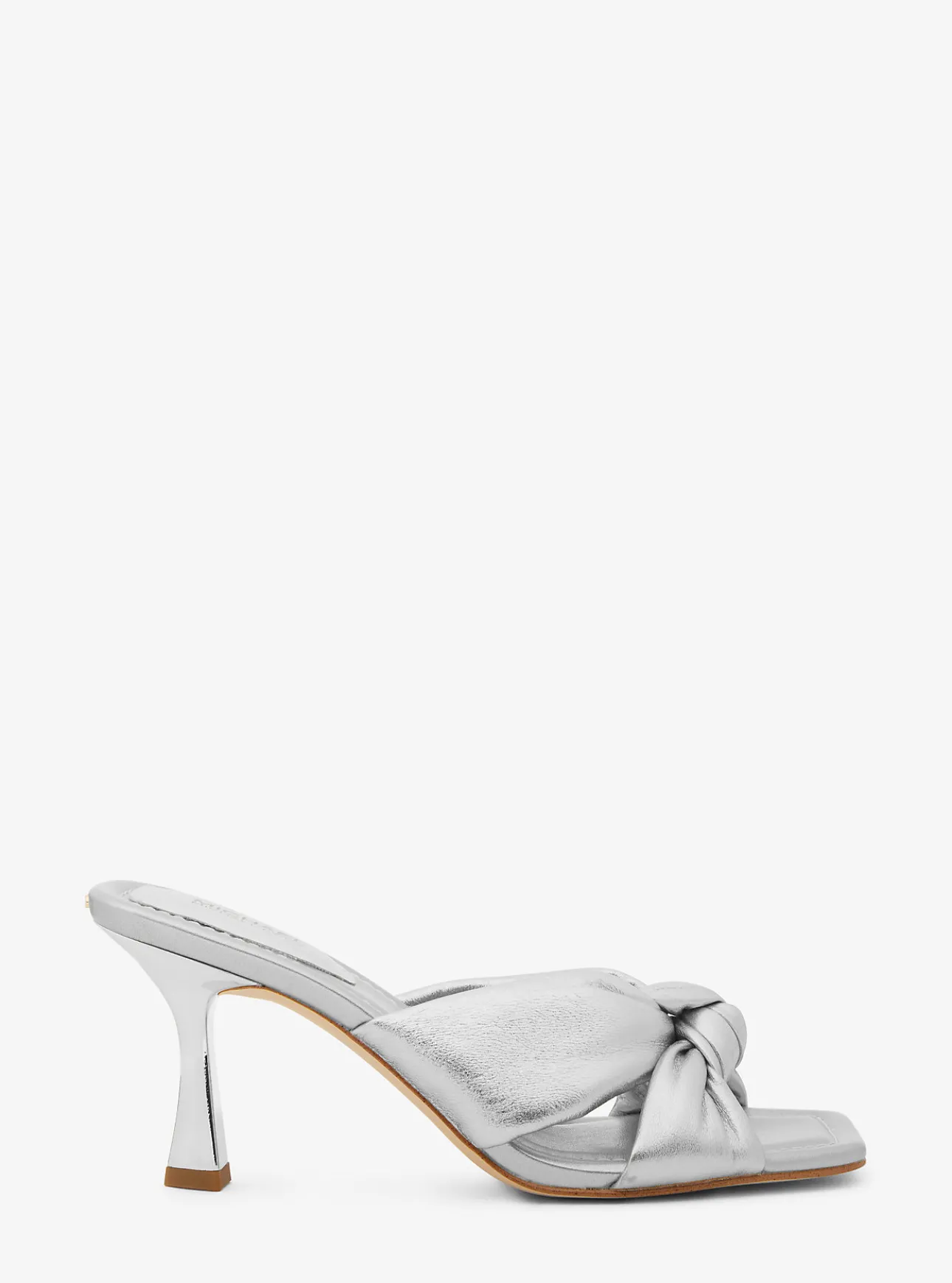Add a dose of chic to your look with the Elena sandal. This feminine pair is crafted from luxe, pillowy metallic leather with a knotted frontal detail, and finished with a lacquered heel for added shine.