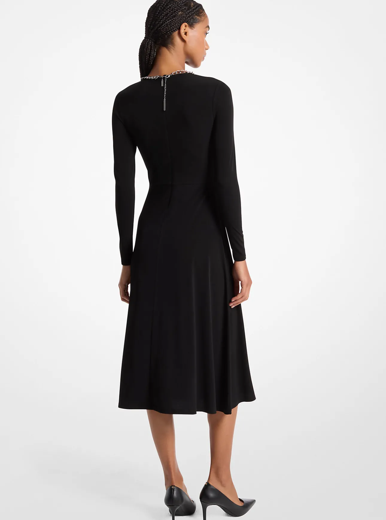 This matte-jersey dress redefines modern elegance. A curb-link neckline and keyhole eliminate the need for a necklace, while a concealed zipper adds a pragmatic finish. Create a stylish look with neutral-hued pumps.