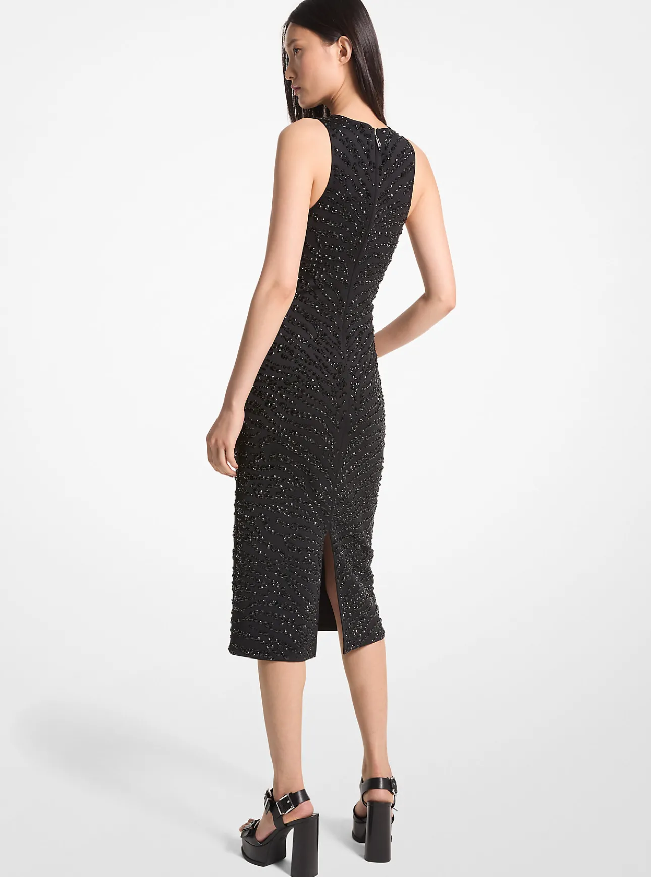 When it comes to event dressing, take your cue from this dazzling midi style and make a statement. It showcases a stretch nylon silhouette embellished with studs in a zebra stripe pattern. Heels are an absolute must.