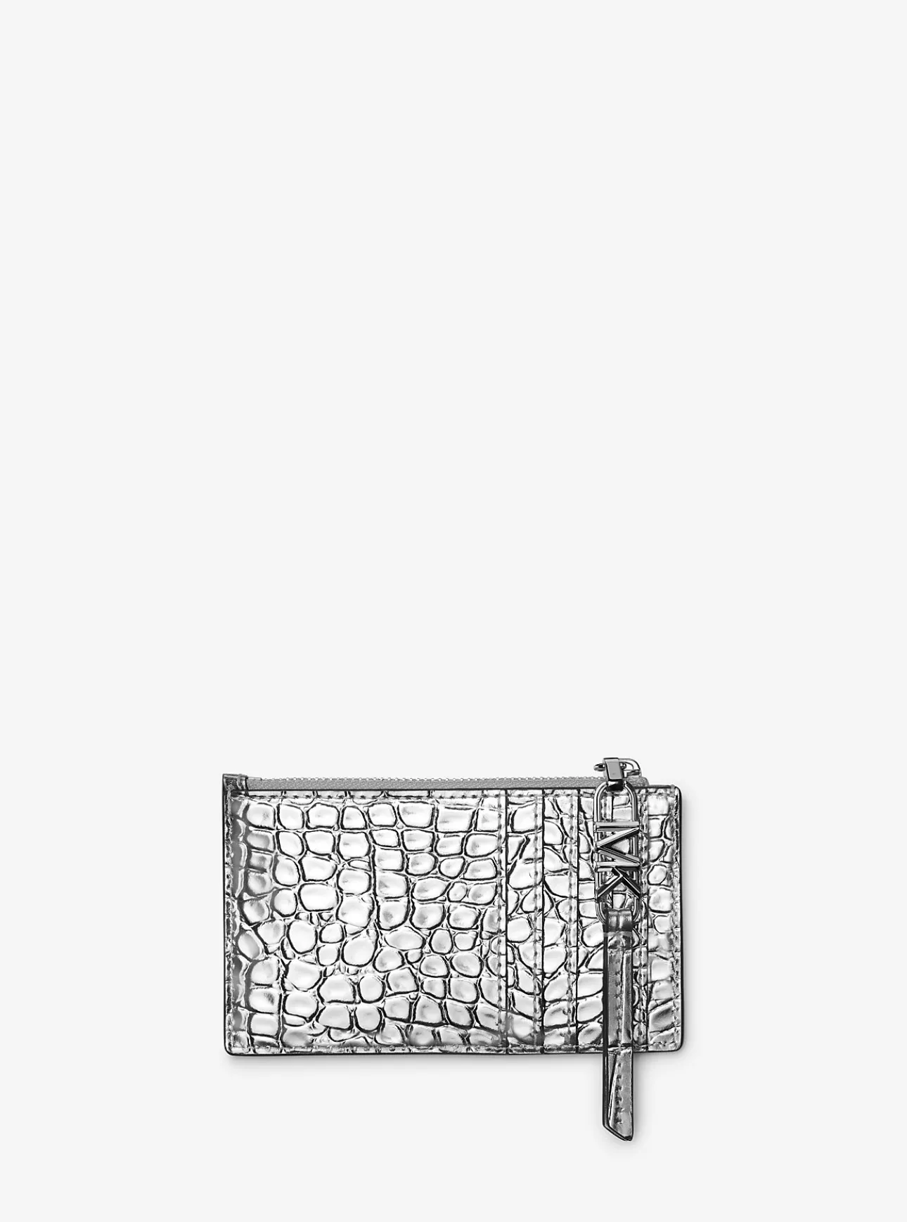 Polished and pragmatic, this slim metallic style is an elevated alternative to traditional card cases. Accented with our Empire hardware for a hint of glamour, it’s crafted from crocodile-embossed leather and features a pocketed exterior for your cards, while a zip-fastened interior compartment offers additional storage for coins and cash. Slip it into your favorite tote.