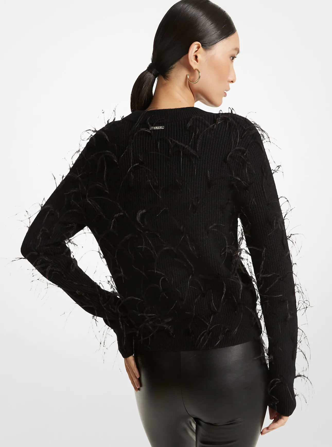 Sweater weather—but make it glam. A smattering of feathers brings unexpected dimension and playful movement to the season’s flattering cropped silhouette. Pair it with liquid-luxe leggings for a night-out look.