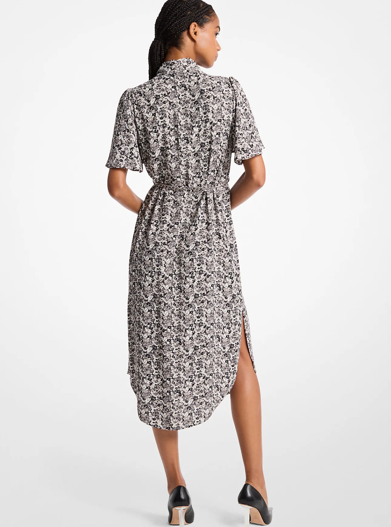 Defined by a romantic floral print and flutter sleeves, this crepe dress features a waist-defining chain belt that descends to a longer back hem for playful movement. Style it with noir pumps for a ladylike look.