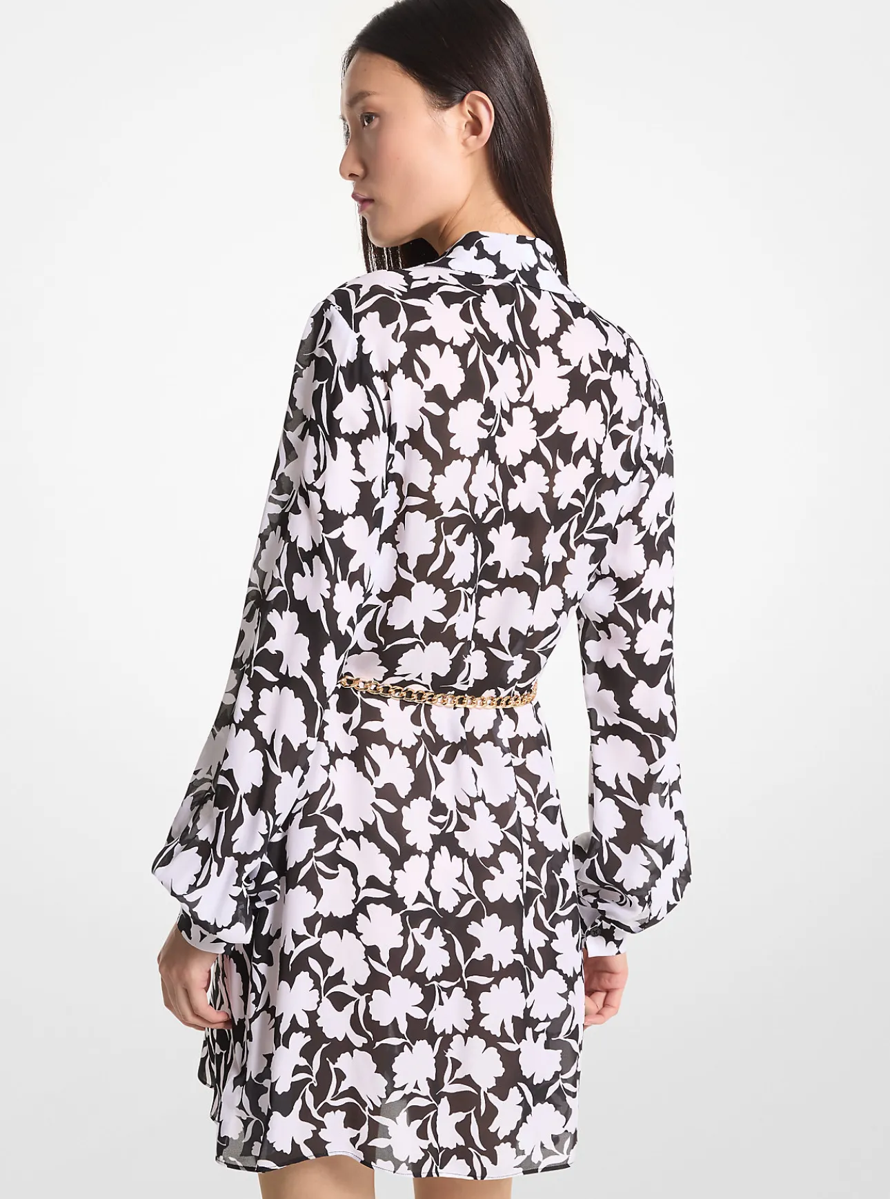 This midi dress is cut from georgette that’s blended with silk for added lightness. Long, flared sleeves and buttons down the front enhance its airy feel. Keep the bold floral print in focus with minimal accessories.