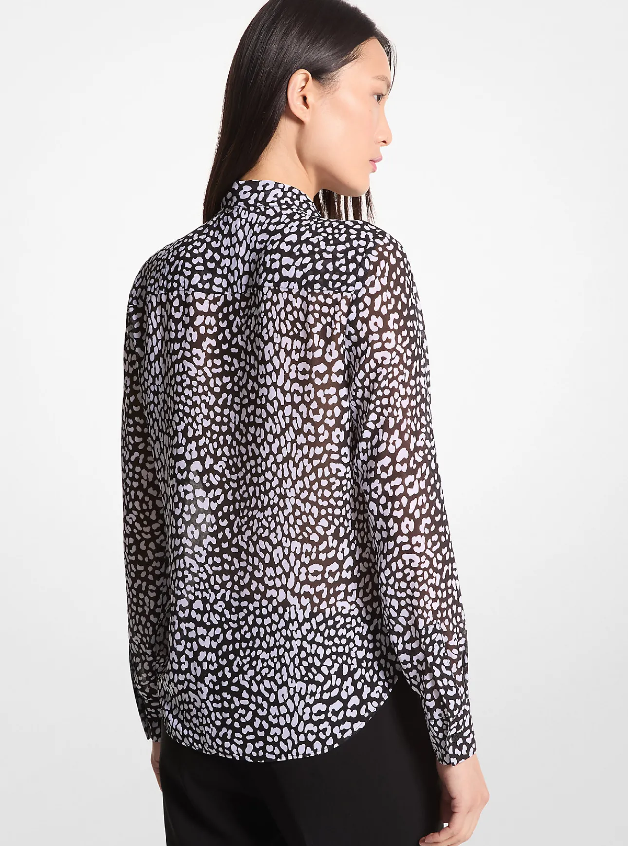 An abstract leopard print makes this polished blouse stand out. Designed to drape loosely over the frame, it has a bow neck and buttoned cuffs that add to its sophisticated feel. Finish the look with a tailored pant and heels.