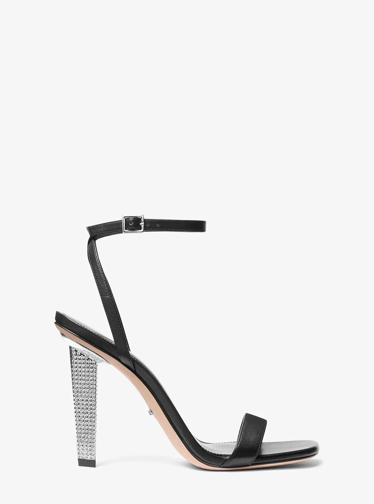 Crafted from supple smooth leather and set on a crystal-studded architectural heel, the Halle sandal will ground a myriad of looks with glamorous style. Designed with a delicate wraparound strap that buckles at the ankle, this style will be your go-to for every special event.