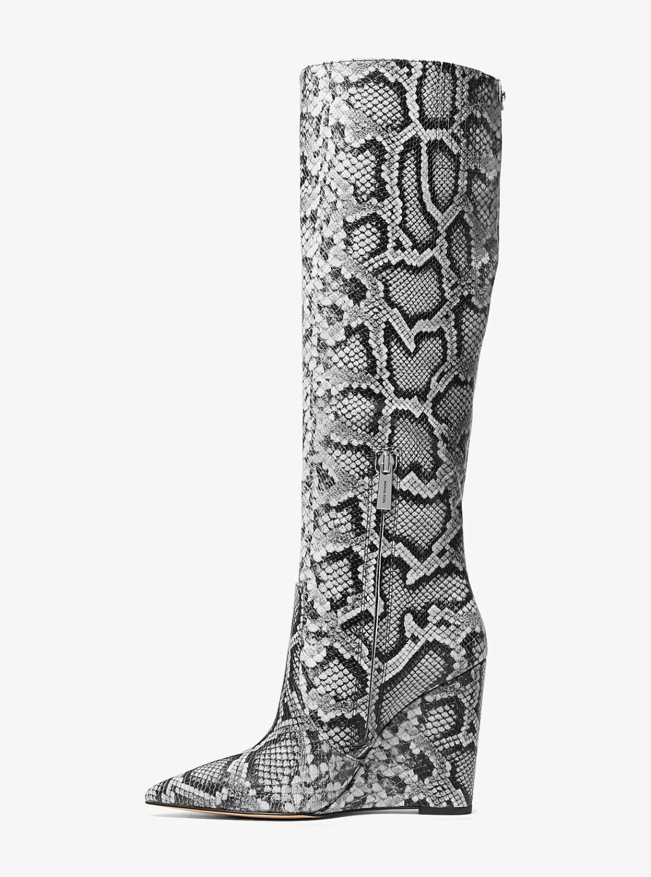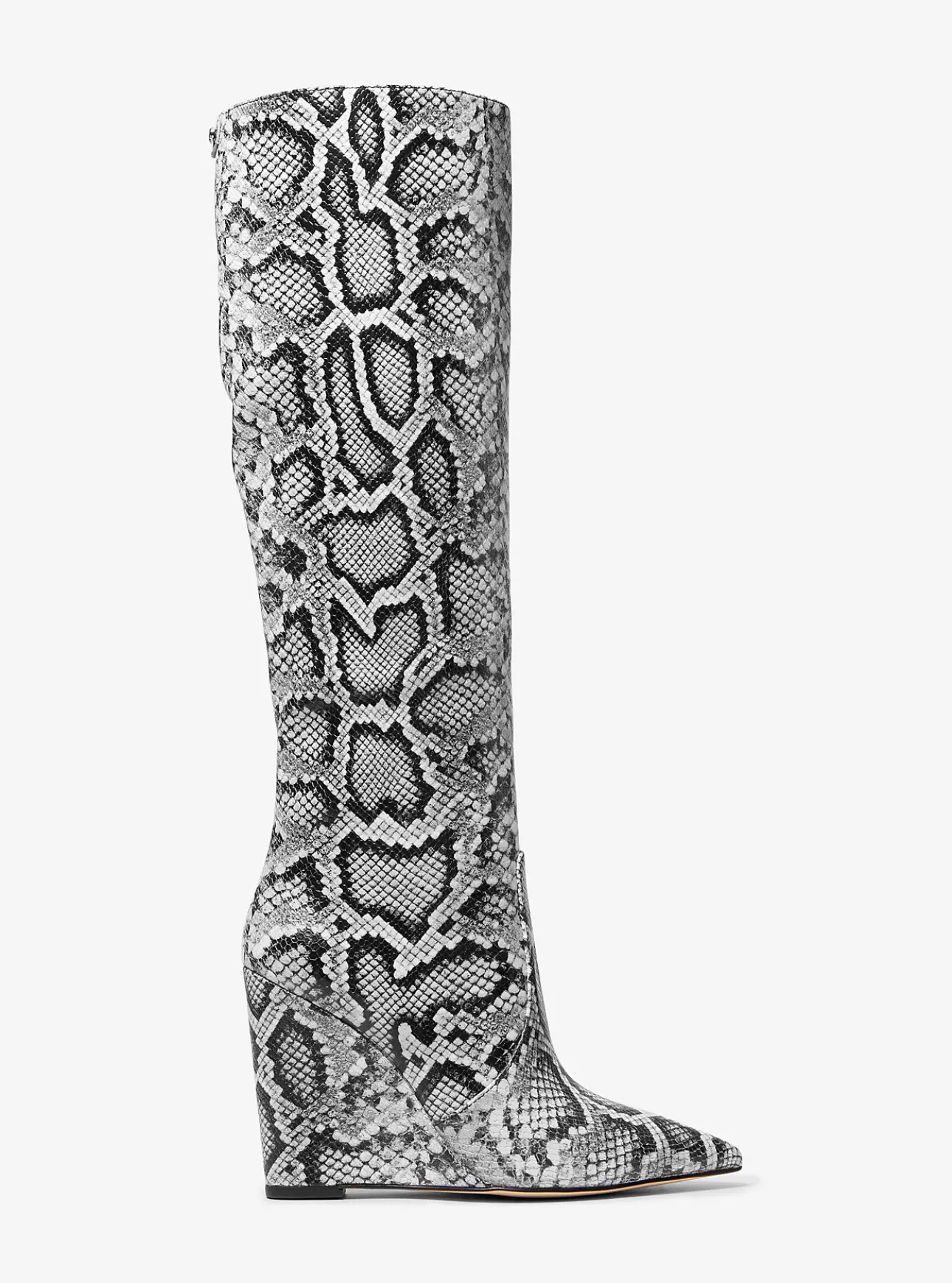 Crafted from snake-embossed leather, the Isra Boot makes a serious style statement. This towering pair features a sleek pointed toe and stands on a tall, wrapped wedge heel. A perfect complement to brights and neutrals alike, try it on with a favorite minidress, or the season’s effortless, baggy denim.
