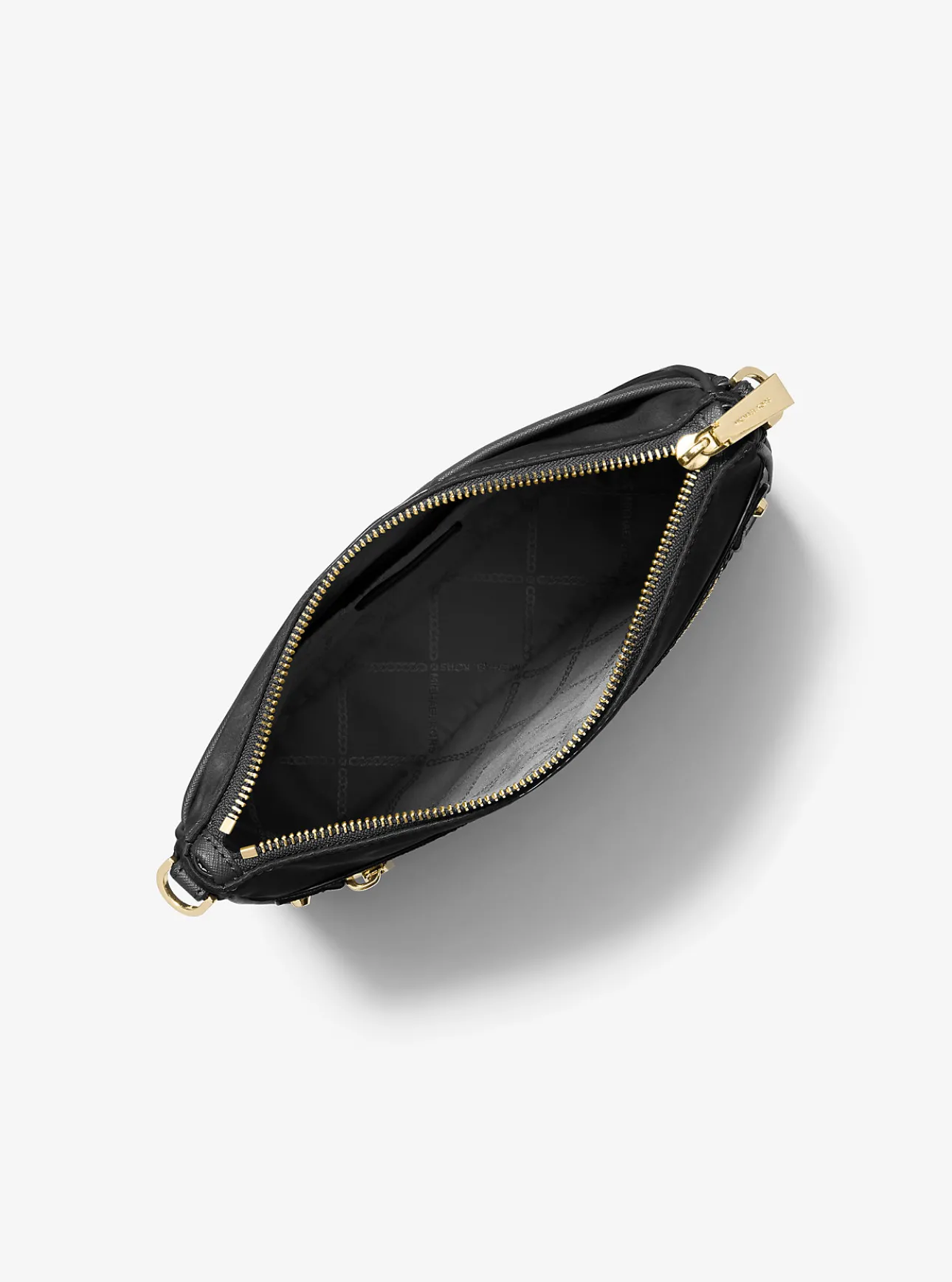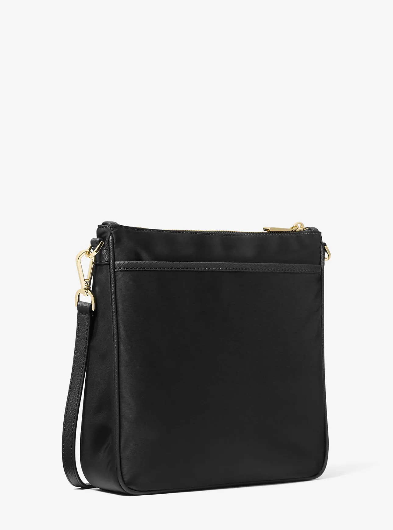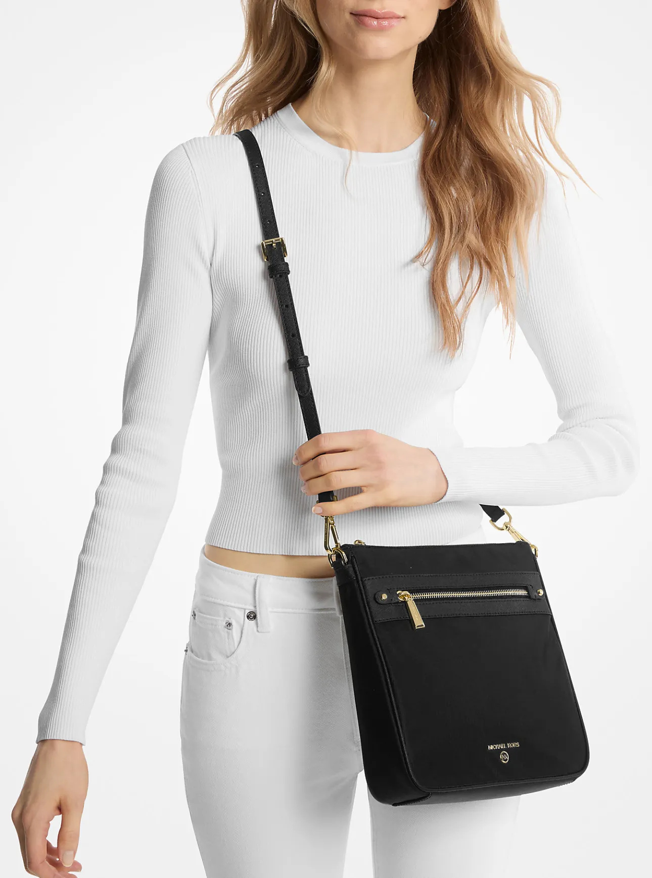 Crafted from durable nylon with Saffiano leather trim, the Jet Set messenger bag offers a timeless approach to accessorizing. This sleek silhouette is anchored by an adjustable crossbody strap and features a secure top-zip fastening, plus a front zip pocket for extra storage.