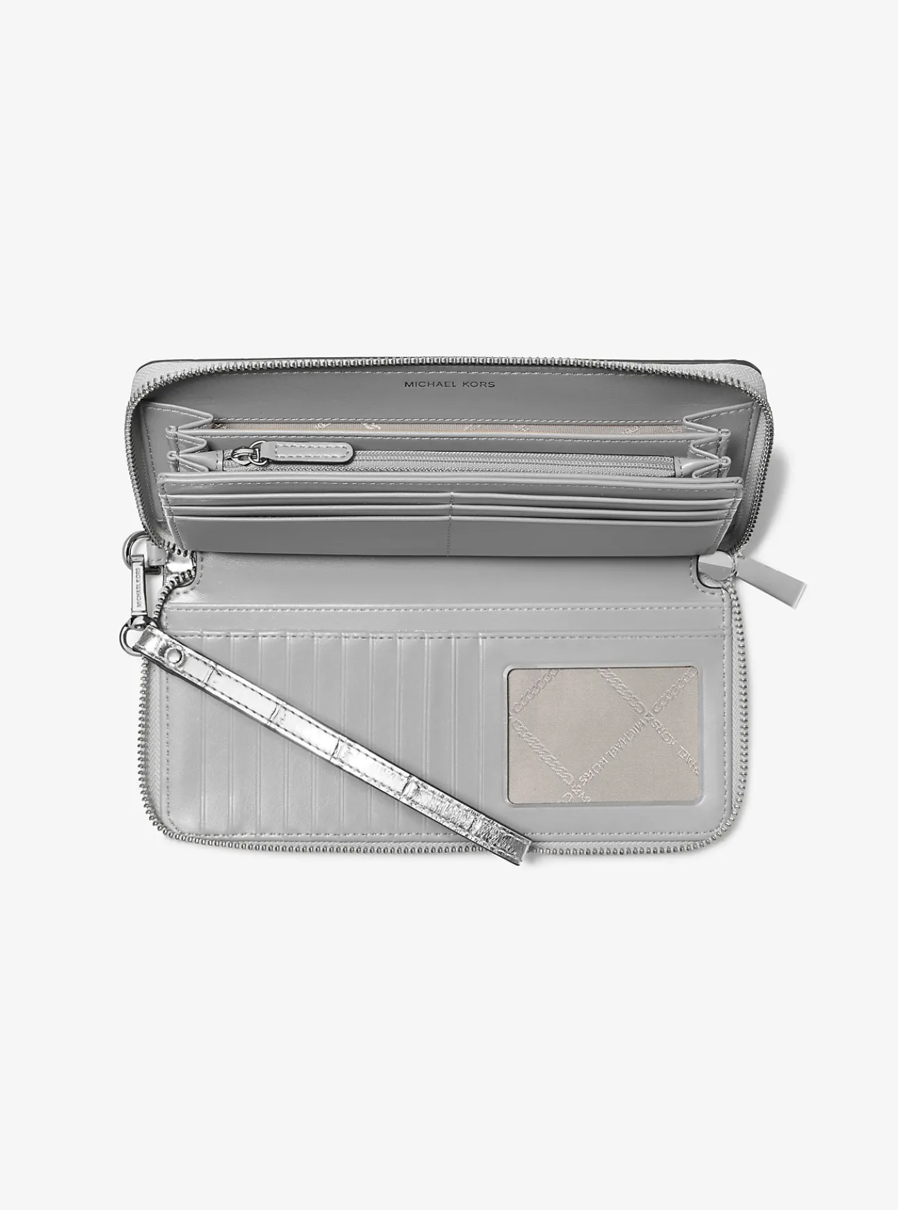 Constructed from metallic crocodile-embossed leather, this sleek wallet is the perfect all-in-one accessory. It features a dedicated pocket for your phone and a wealth of card slots for easy organization. A must-have when traveling or commuting, it can easily be tucked into your carryall or worn as a wristlet.