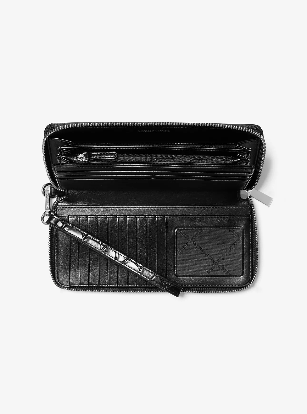 Constructed from crocodile-embossed leather with a patent finish, this sleek wallet is the perfect all-in-one accessory. It features a dedicated pocket for your phone and a wealth of card slots for easy organization. A must-have when traveling or commuting, it can easily be tucked into your carryall or worn as a wristlet.