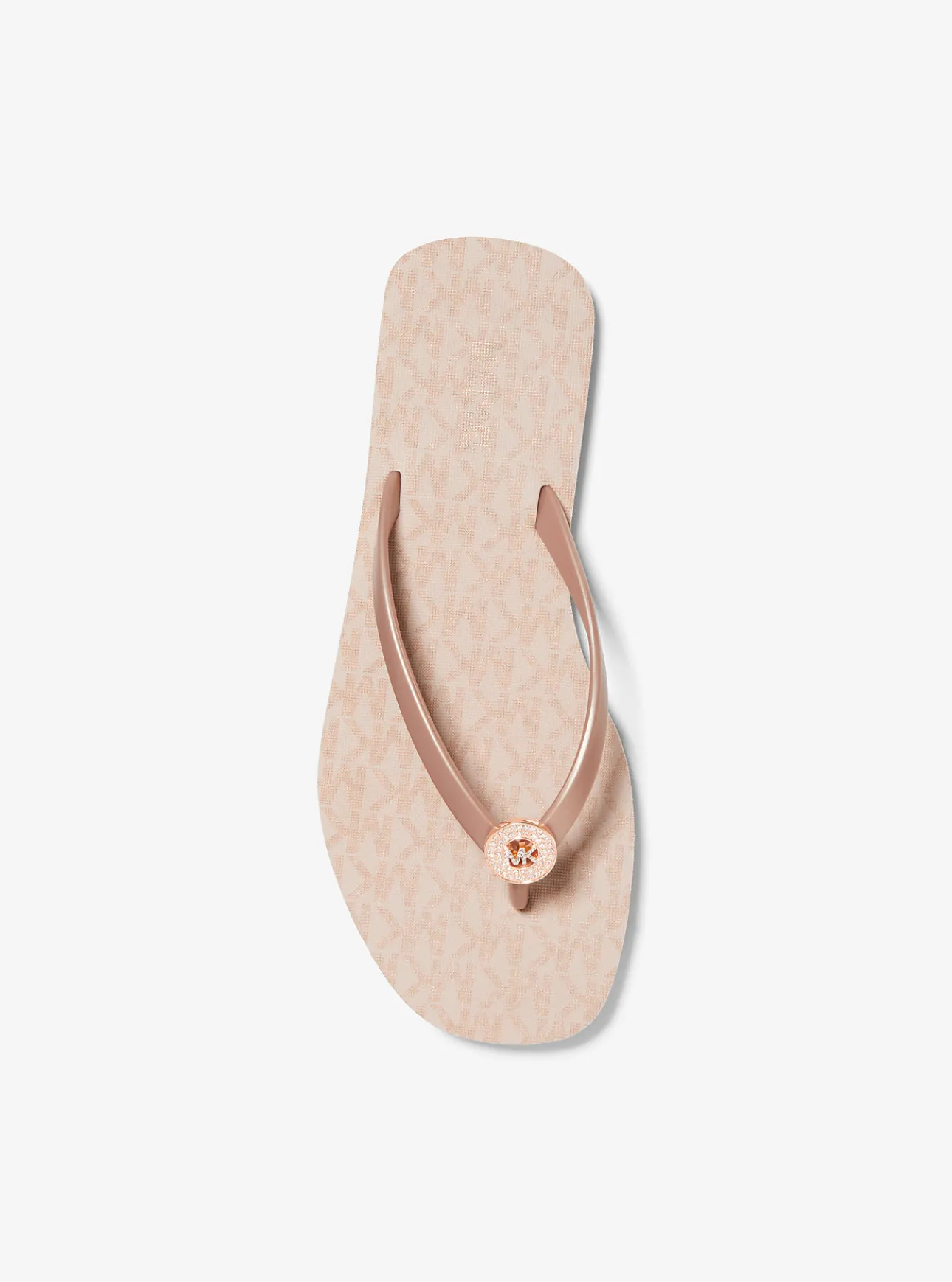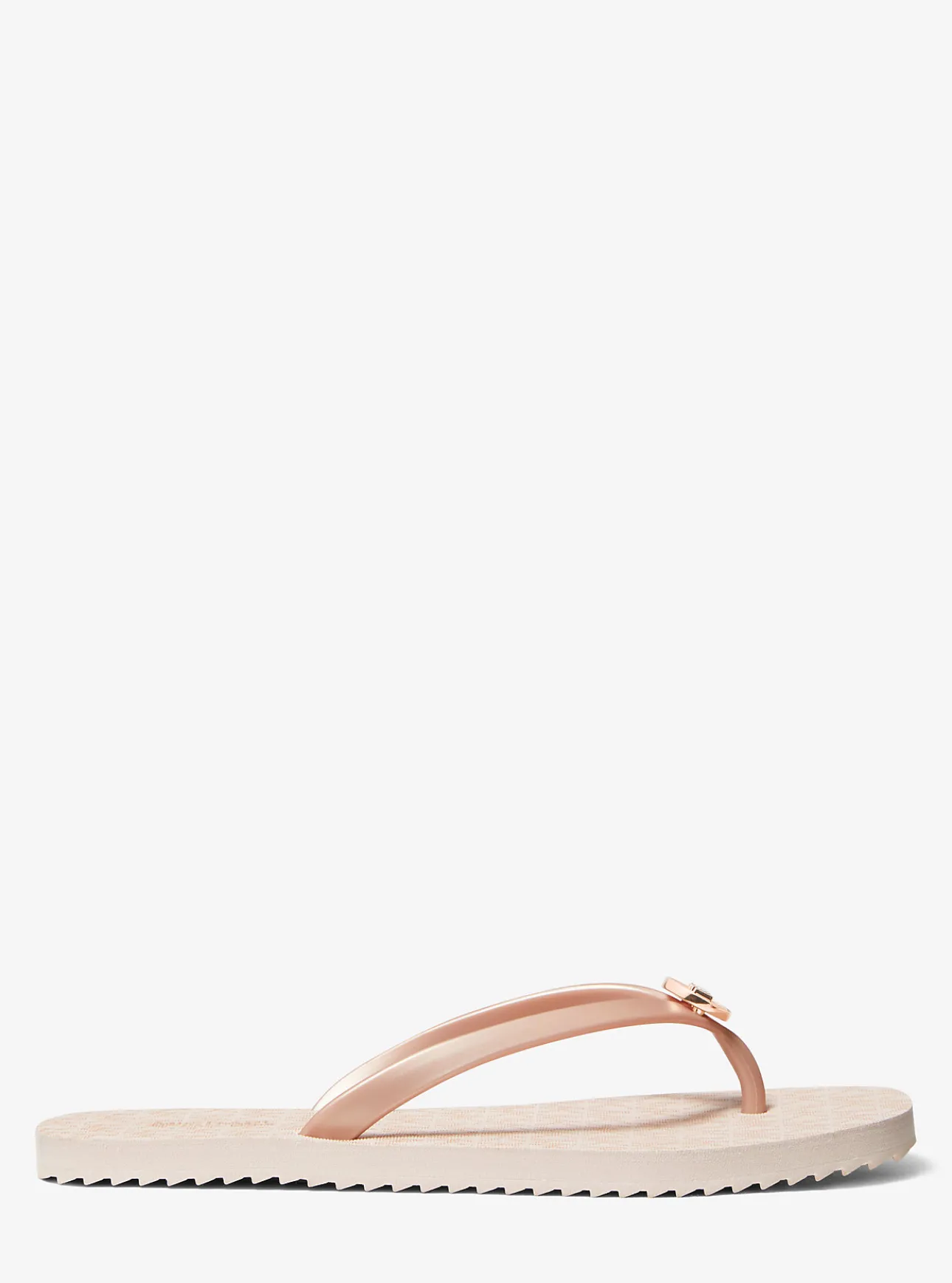 Elevate your casual footwear with the Jinx flip flop. Set on a Signature print footbed, this pair features a serrated rubber sole and an of-the-moment square toe. Finished with an “MK” charm for added polish, we recommend wearing yours with swimsuits and cotton dresses alike.