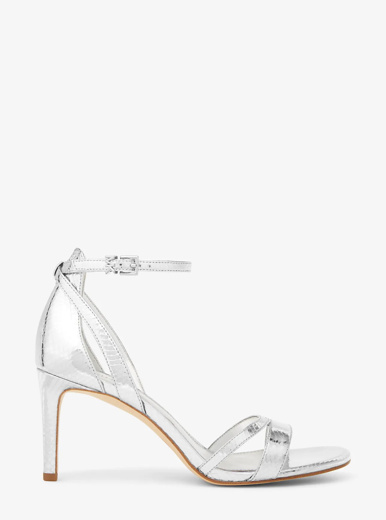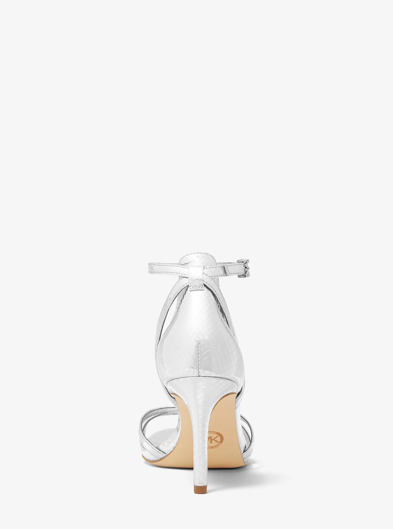 Here to shine, our Kimberly sandal will add a glamorous touch to any ensemble. This strappy style is set on a stiletto heel and finished with a slim ankle fastening to create the illusion of longer legs. With a metallic snake-embossed leather finish, this heel is made to be worn with everything from evening dresses to your favorite pair of denim.