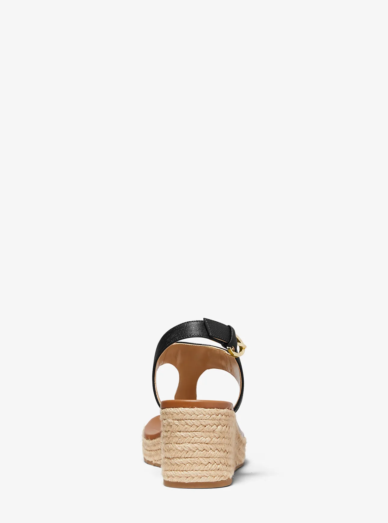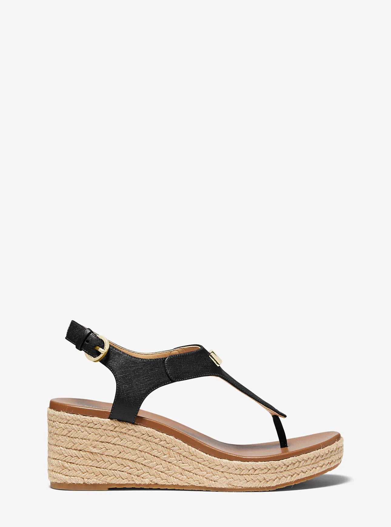Crafted from Saffiano leather and finished with our gilded initials, the Laney sandals combine casual ease with glamour. A woven jute heel offers a comfortable lift, making them perfect for strolling both the boardwalk and city streets.