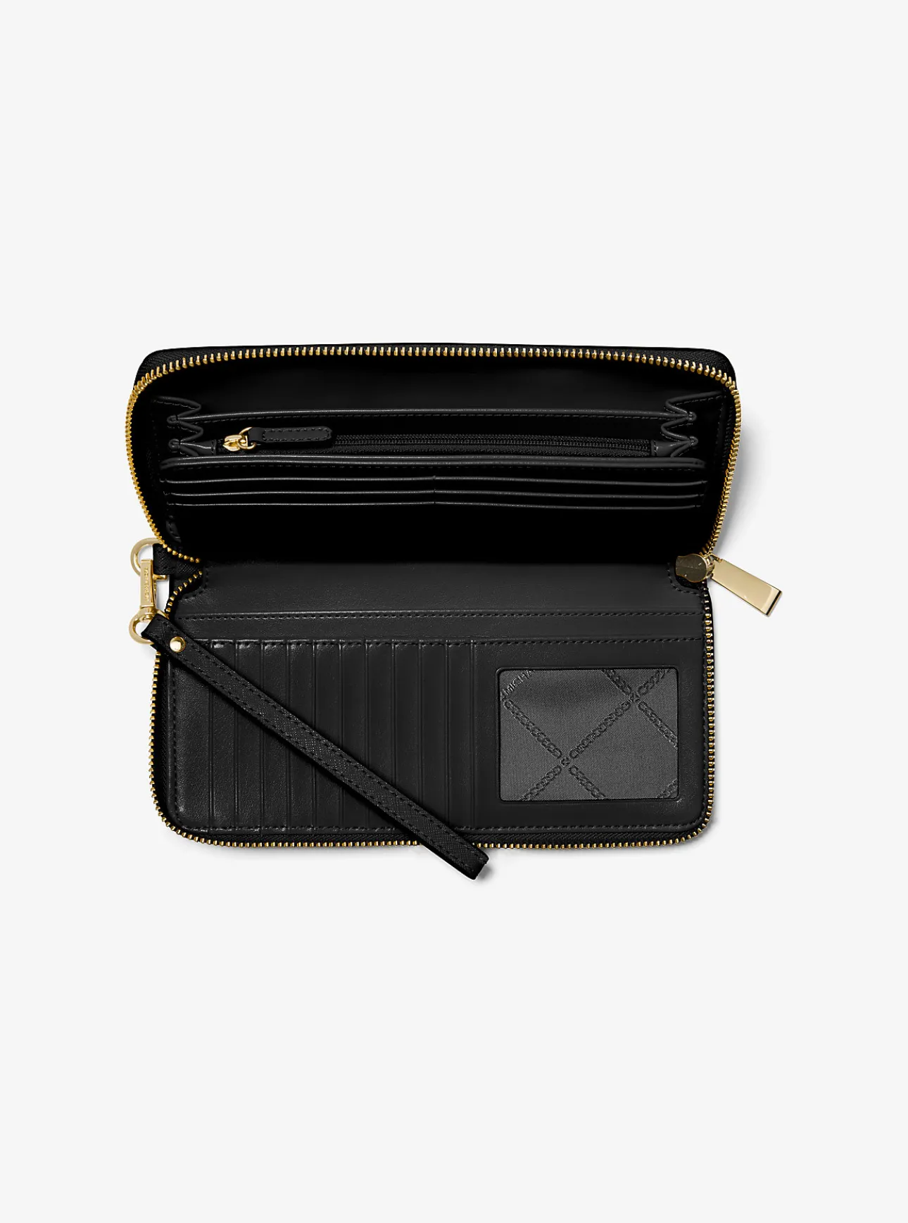 Crafted from Saffiano leather, this sleek wallet is the perfect all-in-one accessory. It features a dedicated pocket for your phone and a wealth of card slots for easy organization. A must-have when traveling or commuting, it can easily be tucked into your carryall for everyday functionality.