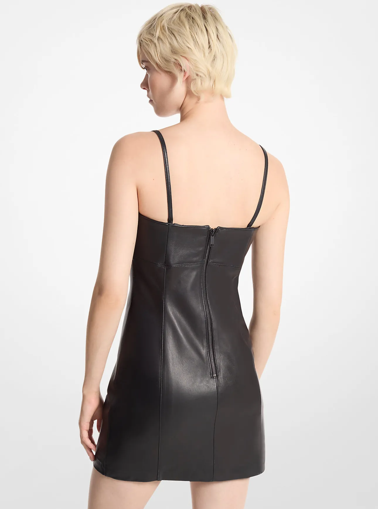 Big-city style comes calling with this mini dress. Suspended from adjustable straps, it’s cut from ultra-soft leather with topstitching that accentuates the close-fitting silhouette. Wear it downtown with loafers and socks.