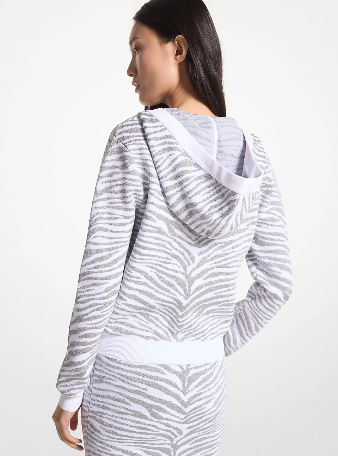 Loungewear never looked so chic. This elevated zip-up hoodie features glittering silver and white stripes to create a striking zebra jacquard pattern. Layer it over the matching tank dress for a cool off-duty look.