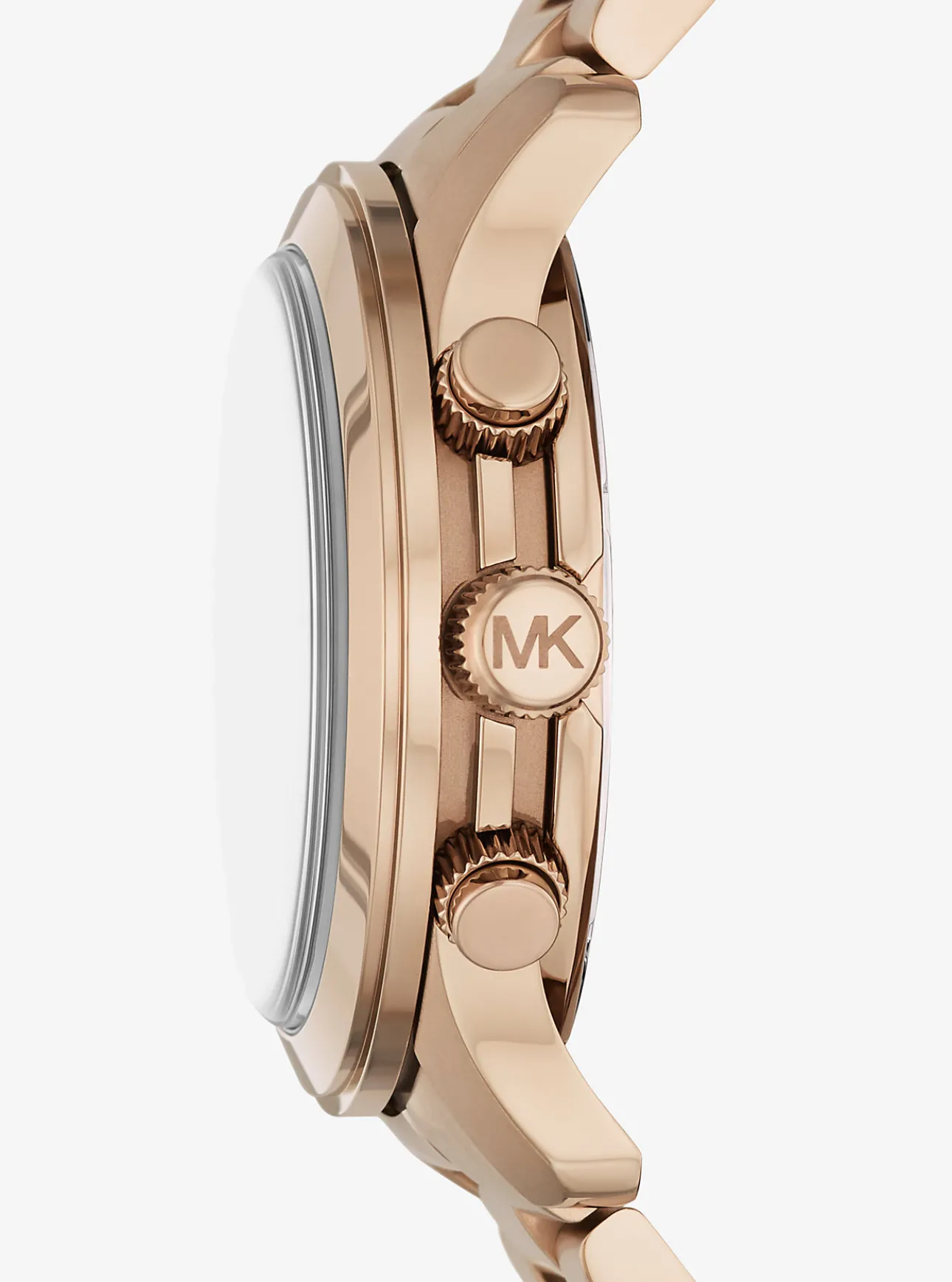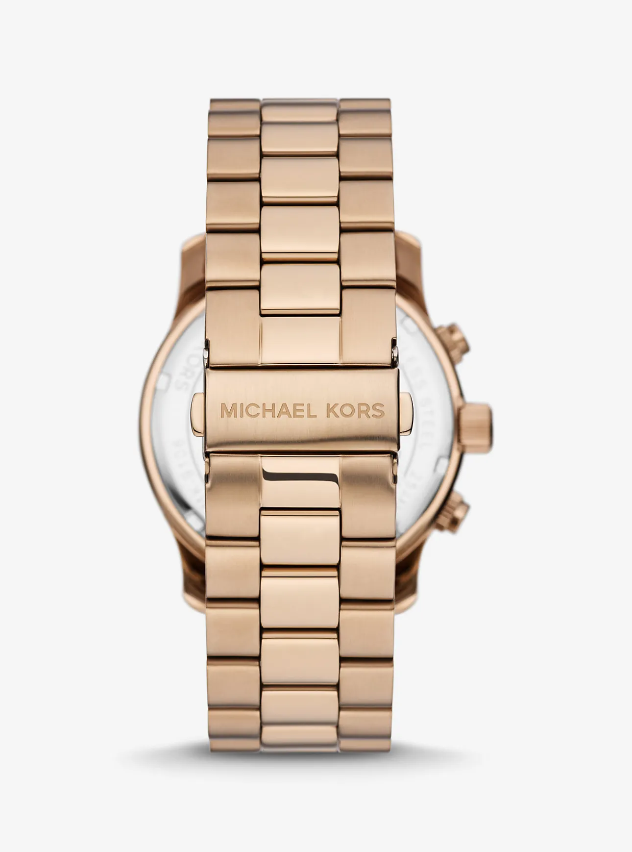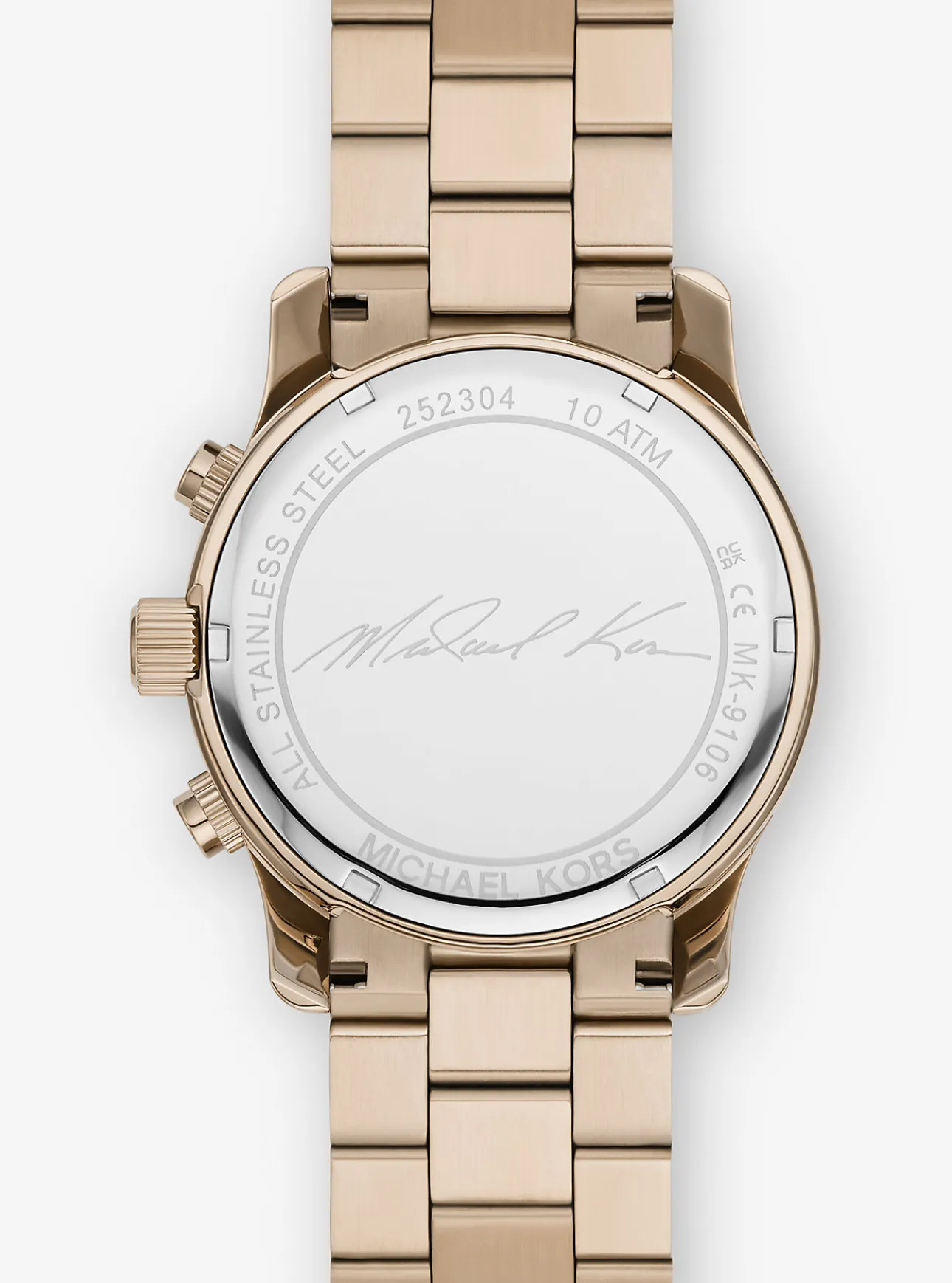 A perennial favorite, our Runway watch is updated with a sunken two-tone dial for a refined, versatile finish. This ultra-sleek style is crafted from beige gold-tone stainless steel with a polished bracelet strap, and features chronograph details for precise timekeeping.