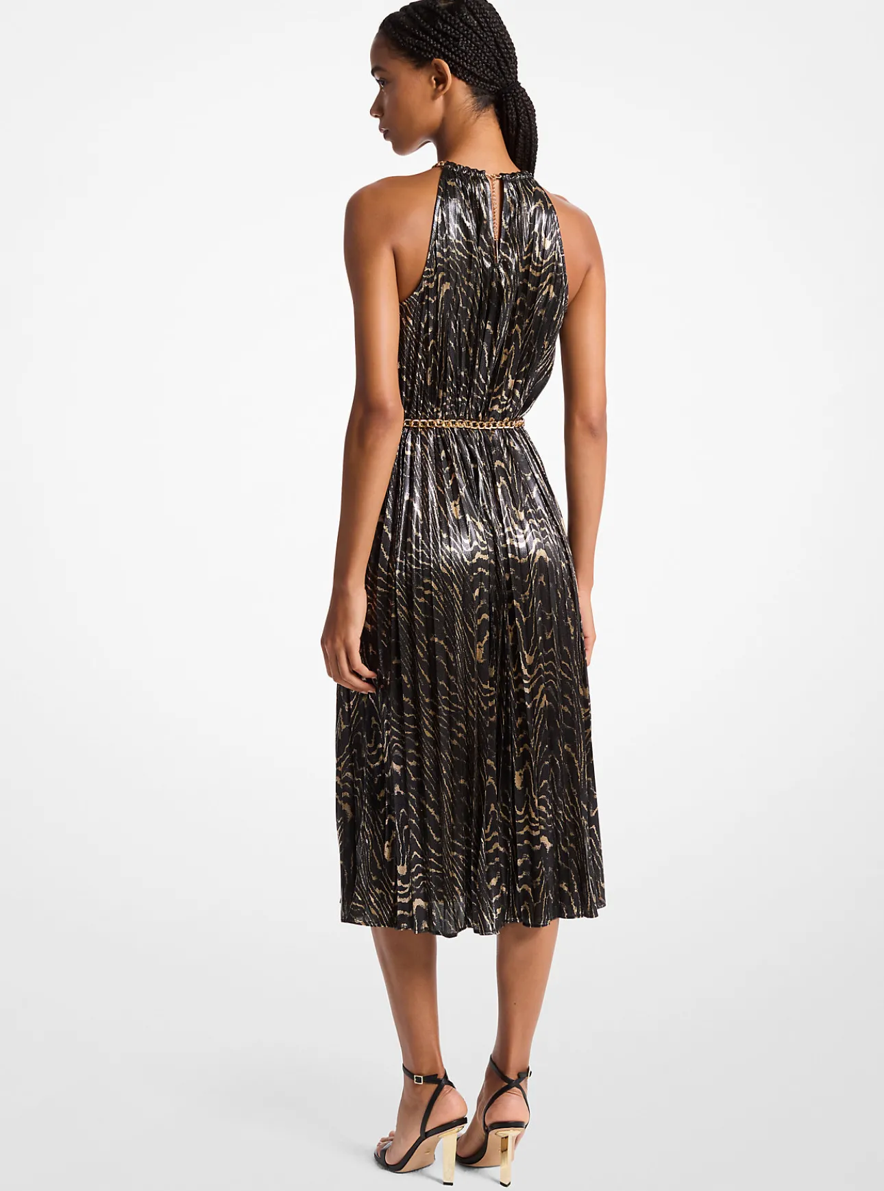 The halter dress returns for the season and is more covetable than ever. This latest version is printed with an abstract foil motif, offset by a gleaming chain-link halter neckline and pleating throughout. All you need is a clutch and barely-there sandals to complete the look.