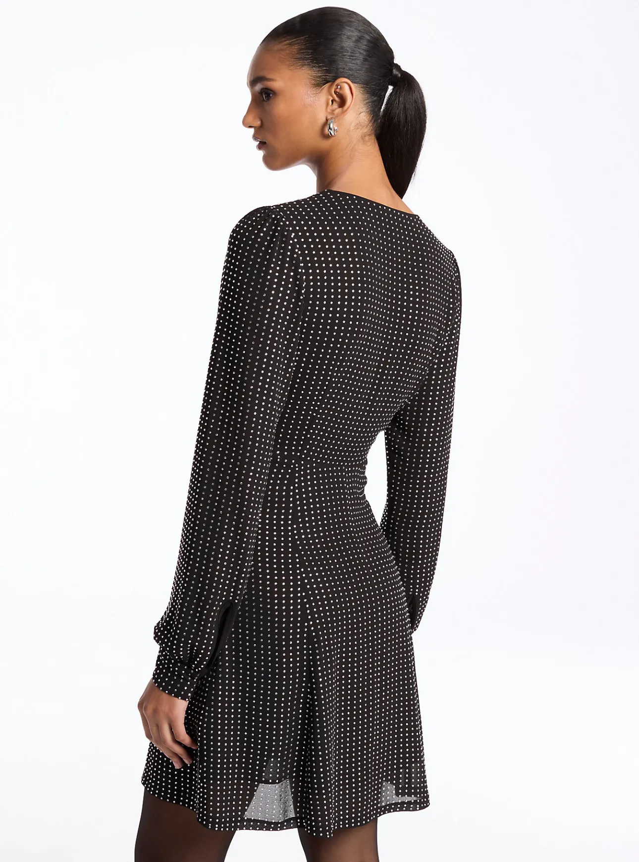 Allover rhinestone embellishments ensure this georgette mini dress stands out. Featuring a V-neckline, empire waist and blouson sleeves, it’s equal parts sultry and sophisticated. Reach for it any time the dress code calls for something sparkly.