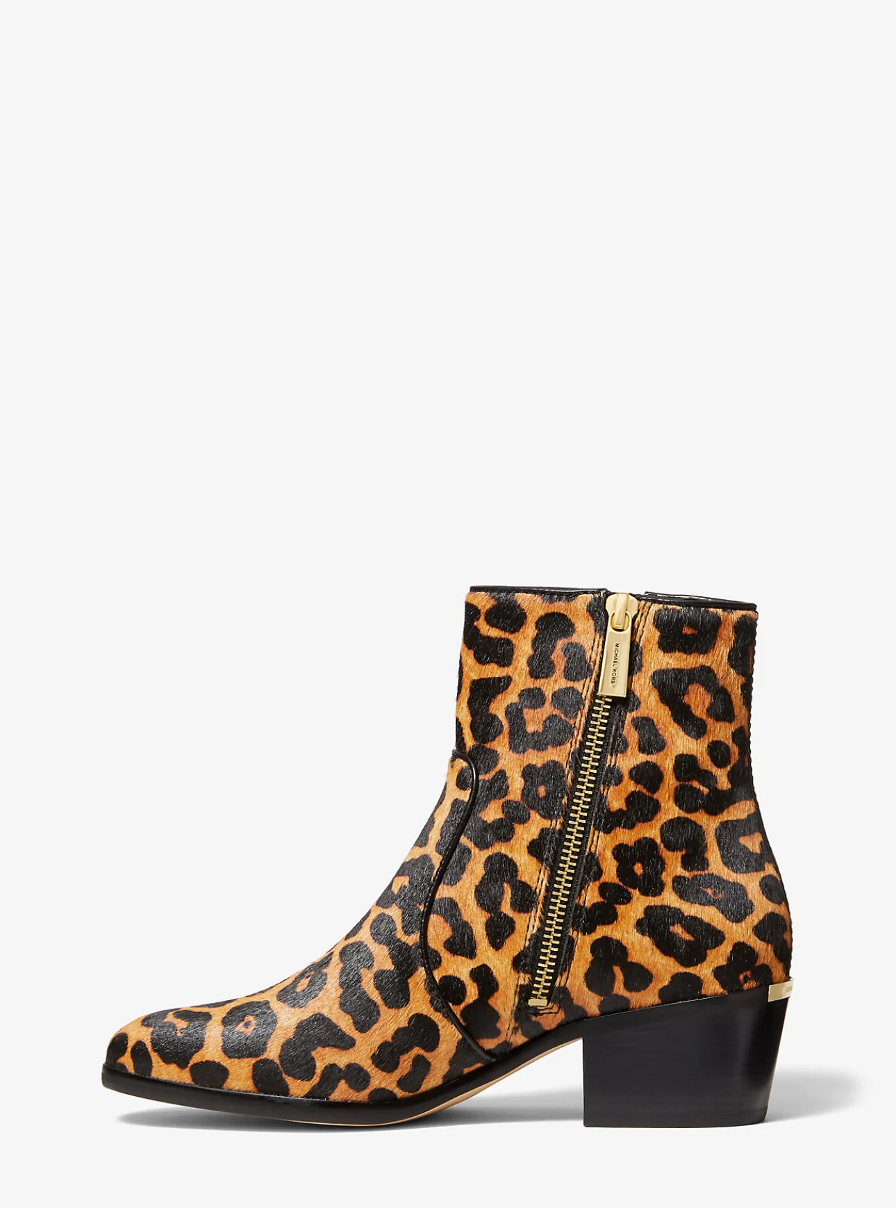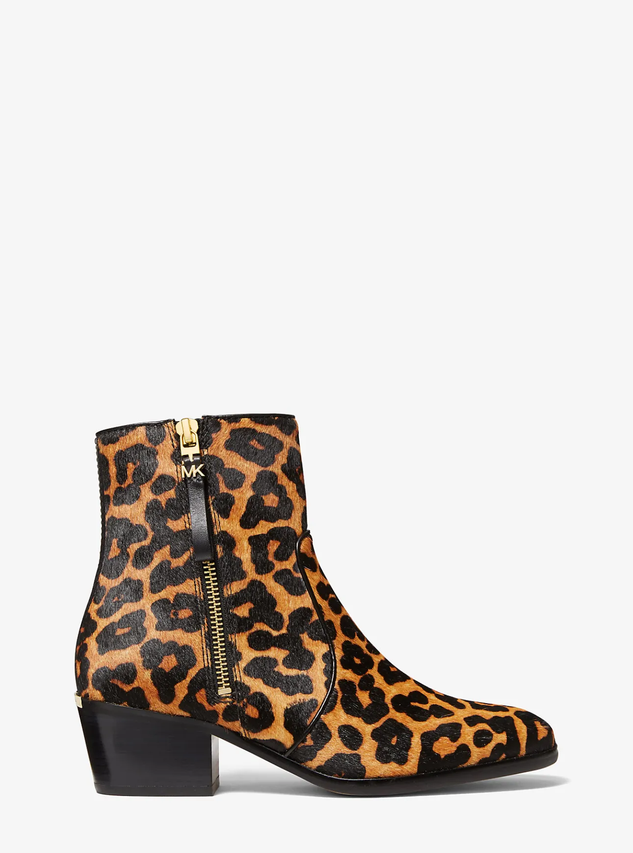 Our Sawyer bootie is the season’s can’t-miss style. In a classic silhouette with an almond toe and stacked heel, it’s crafted in leopard-print calf hair for playful personality. Wear yours as a bold finish to an all-black look.