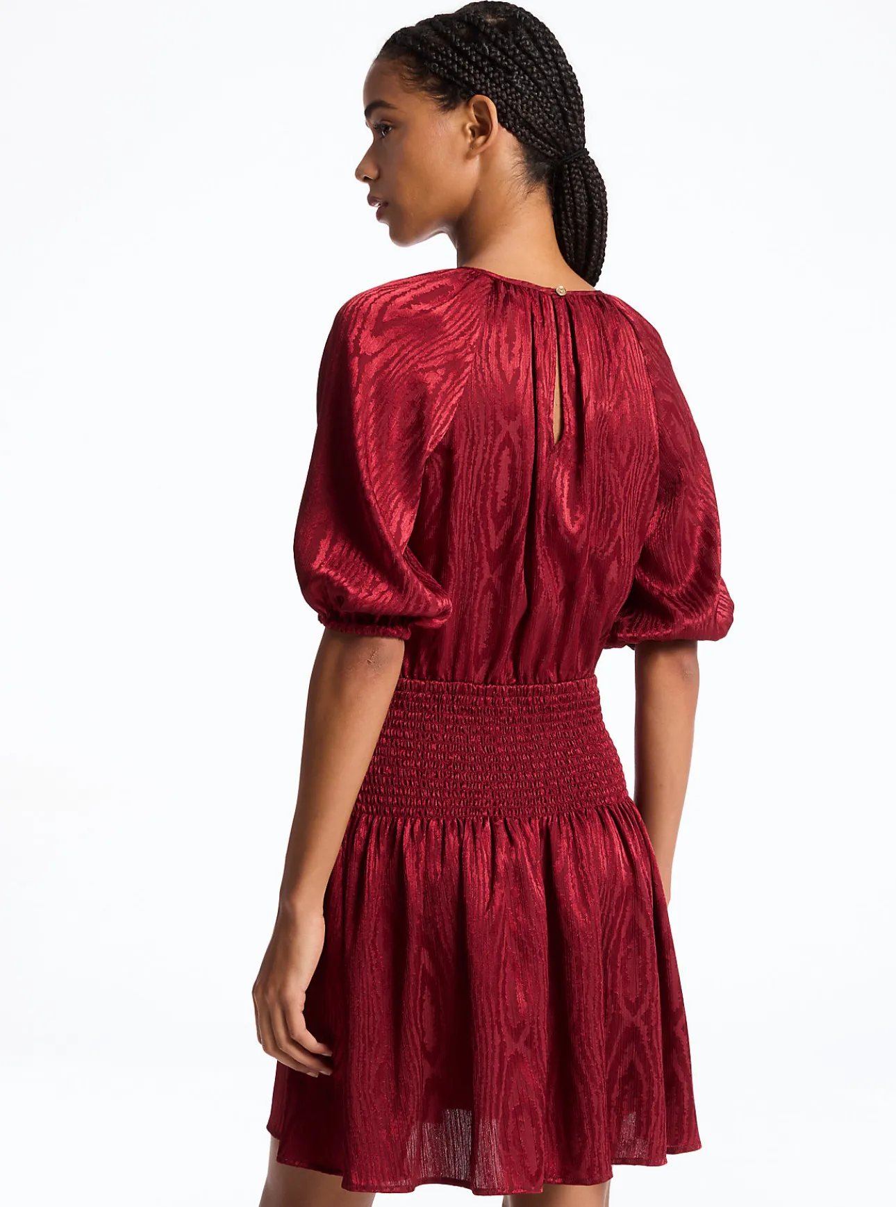 A moiré effect adds a festive vibe to this otherwise essential dress. Complete with elbow-length sleeves, it’s detailed with smocking to define the waist and a floaty mini hem. Wear it to the next daytime event on your calendar.