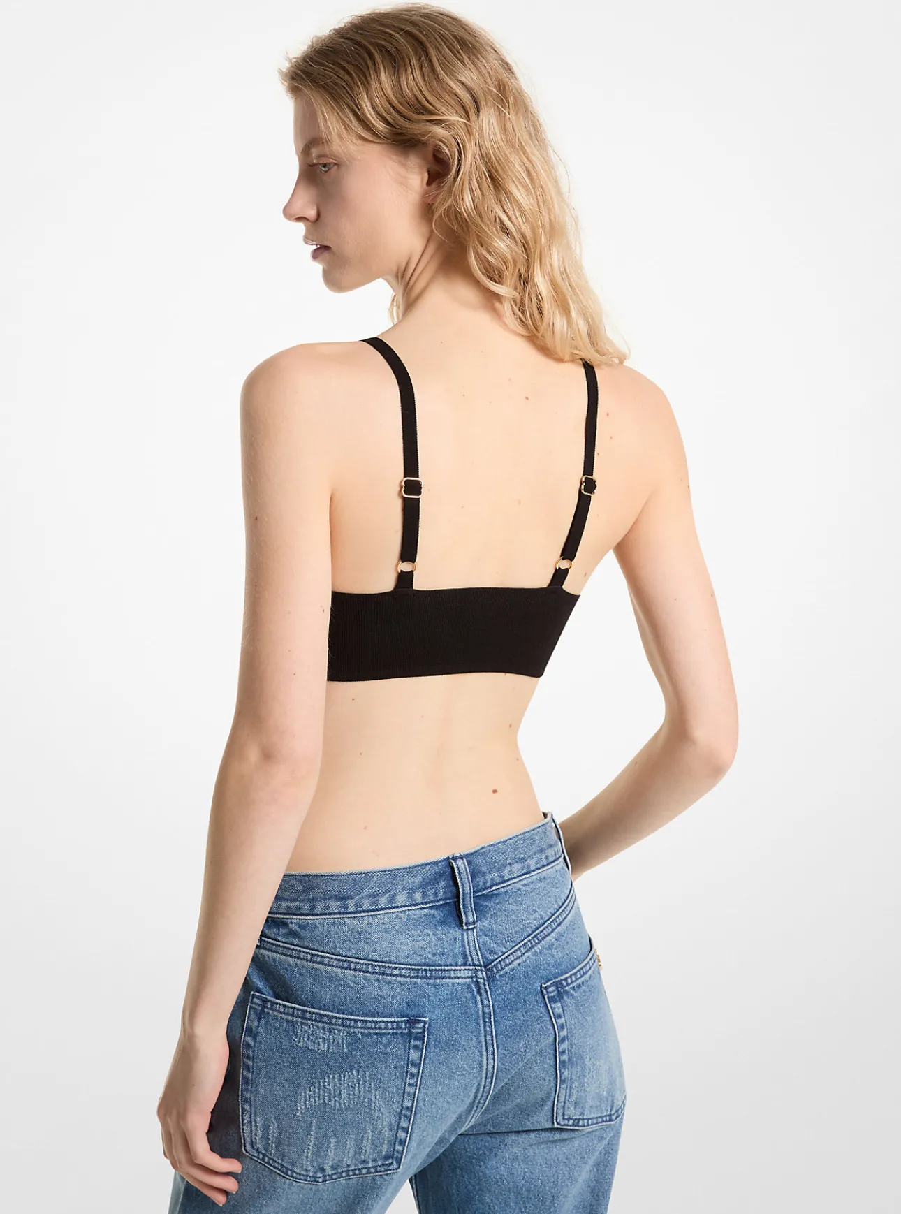 This bra top is a chic counterpart to the season’s knit separates. Made from a recycled viscose blend infused with stretch, it’s designed for a supportive, close fit. Highlight the V-neckline with delicate gold jewelry.