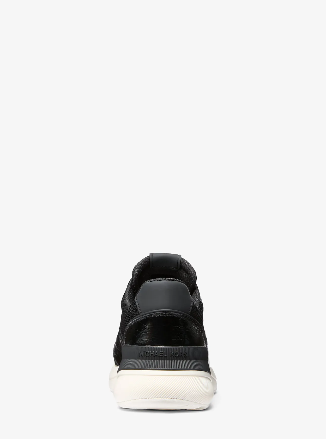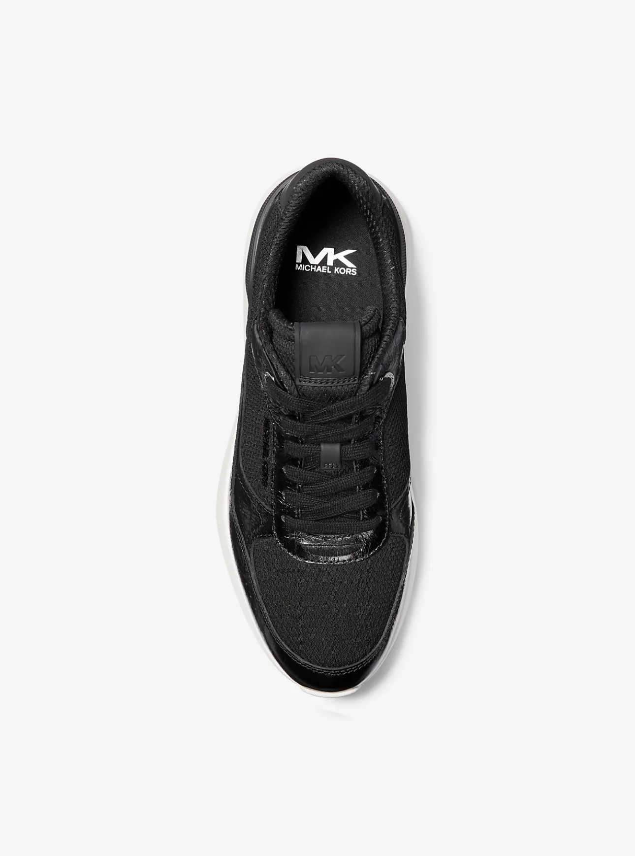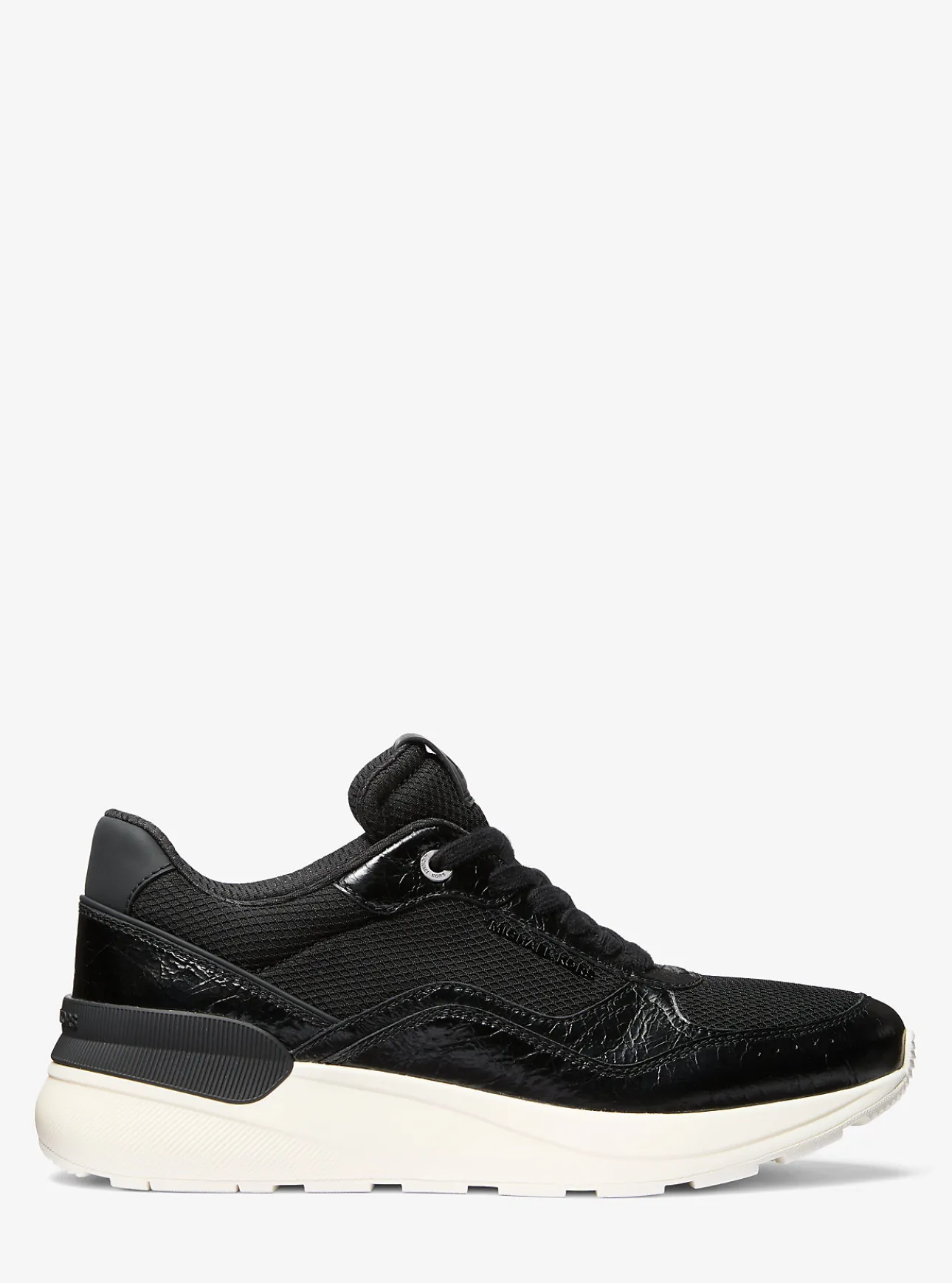 Effortless ease. The Trevor trainer is a sleek and sporty silhouette crafted from an interplay of stretch knit, crinkled patent leather and rubber. The mixed-media upper is balanced with cushioned soles that are perfect for long days on your feet. Wear yours with tapered joggers.