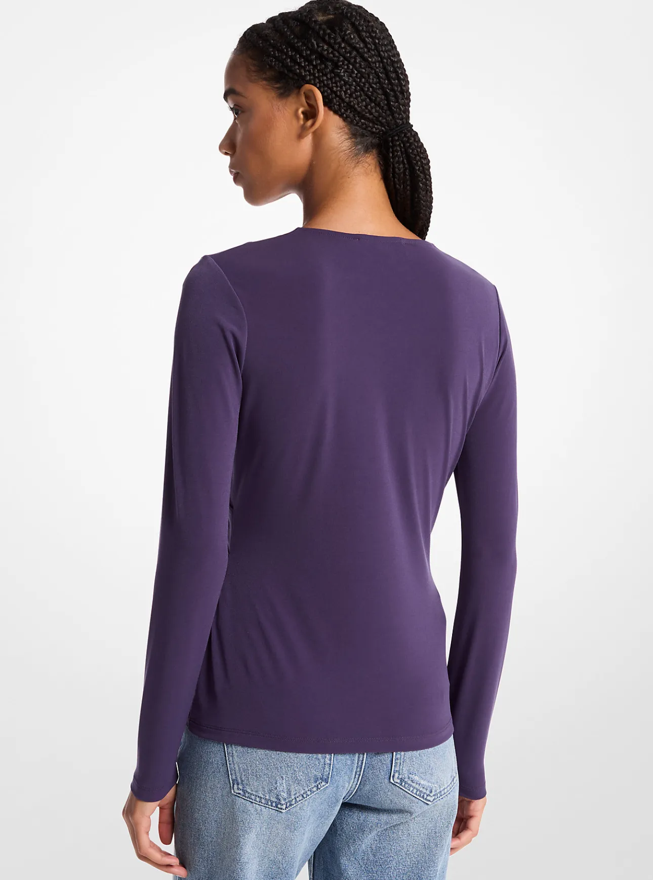 Cut from smooth matte jersey, this top is detailed with shining studs that nod to our heritage Astor handbag. The minimal design and faux-wrap detail make it an easy match with denim.