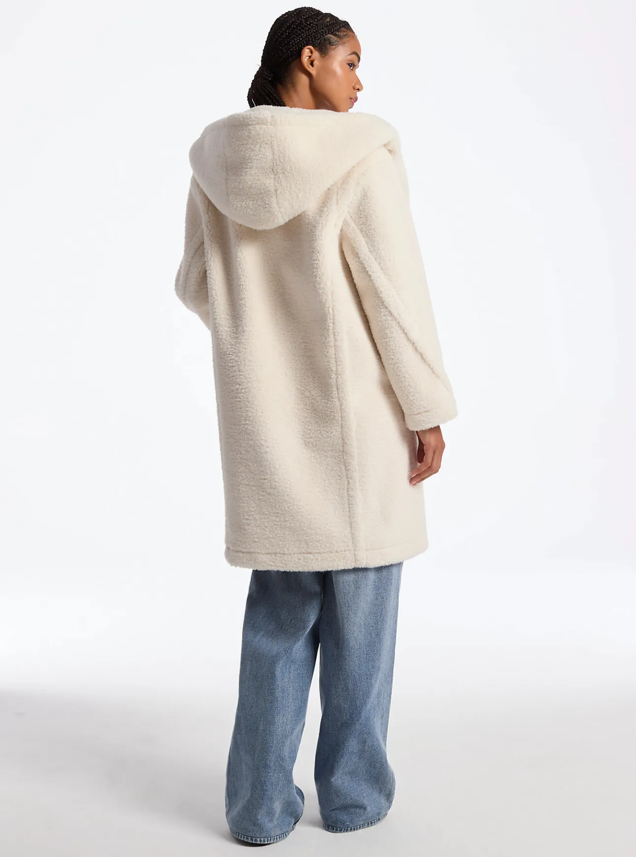 Like cozying up in a warm blanket, this faux fur teddy coat features a longline, double-breasted silhouette and oversized lapels that double as a hood. Layer it over everything from slip dresses to denim jeans.