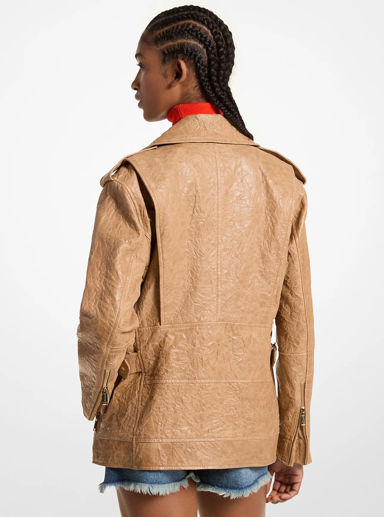 Crafted from buttery crinkled leather with gold-tone hardware, this oversized moto jacket is a rebellious update on the classic. Easy to style with just about anything, it’s an ideal topper over mini dresses, slim jeans and more.