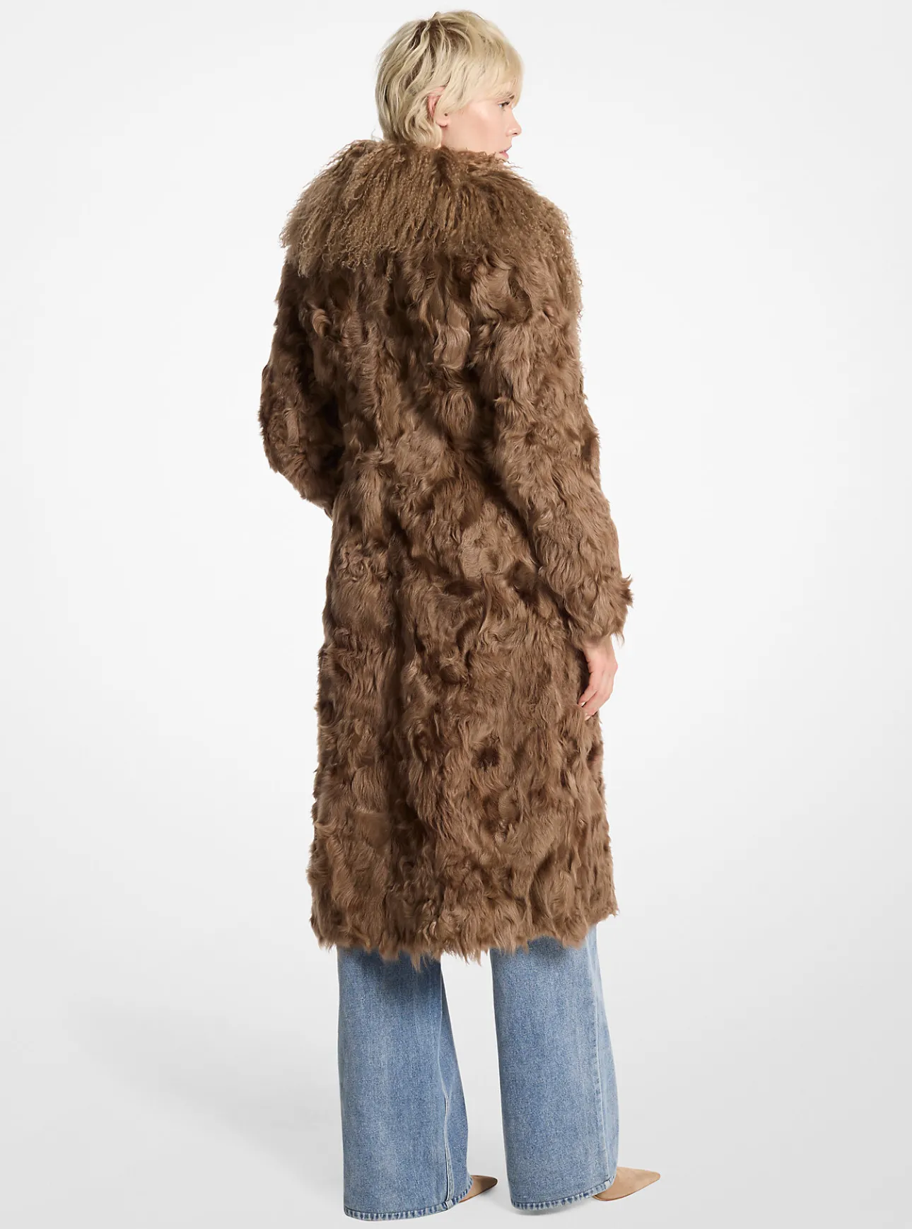 Feel like pure luxury in this 100% shearling coat. With a knee-length silhouette and an oversized shag collar, it delivers instant opulence—and a touch of vintage glamour—to both day and evening looks.